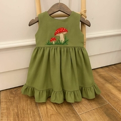 As cenas bordadas à mão, como cogumelos e florais, tornam cada peça única e cheia de personalidade. Produzido sob encomenda com muito carinho, o vestido reflete o cuidado da Petit & Co com cada detalhe — um verdadeiro tesouro feito para durar e ser lembrado.
